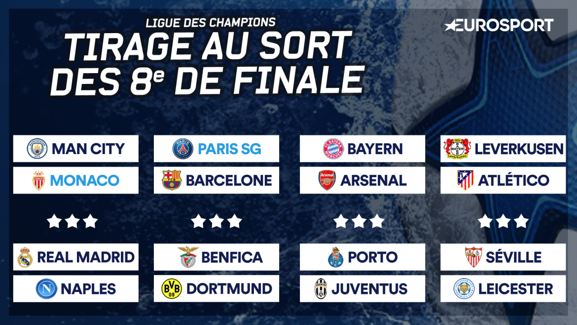 Dans les autres rencontres, on notera un nouveau choc, désormais classique, entre le Bayern Munich et Arsenal, qui sera sans conteste l'affiche de ces huitièmes de finale. Les deux finalistes de l'an dernier, le Real et l'Atlético, seront eux opposés à Naples et à Leverkusen, deux confrontations très abordables. Et comme le FC Séville croisera Leicester, champion d'Angleterre en titre mais loin de son niveau de l'an passé, l'hypothèse d'une présence espagnole massive en quarts de finale n'est pas absurde. Une fois encore.